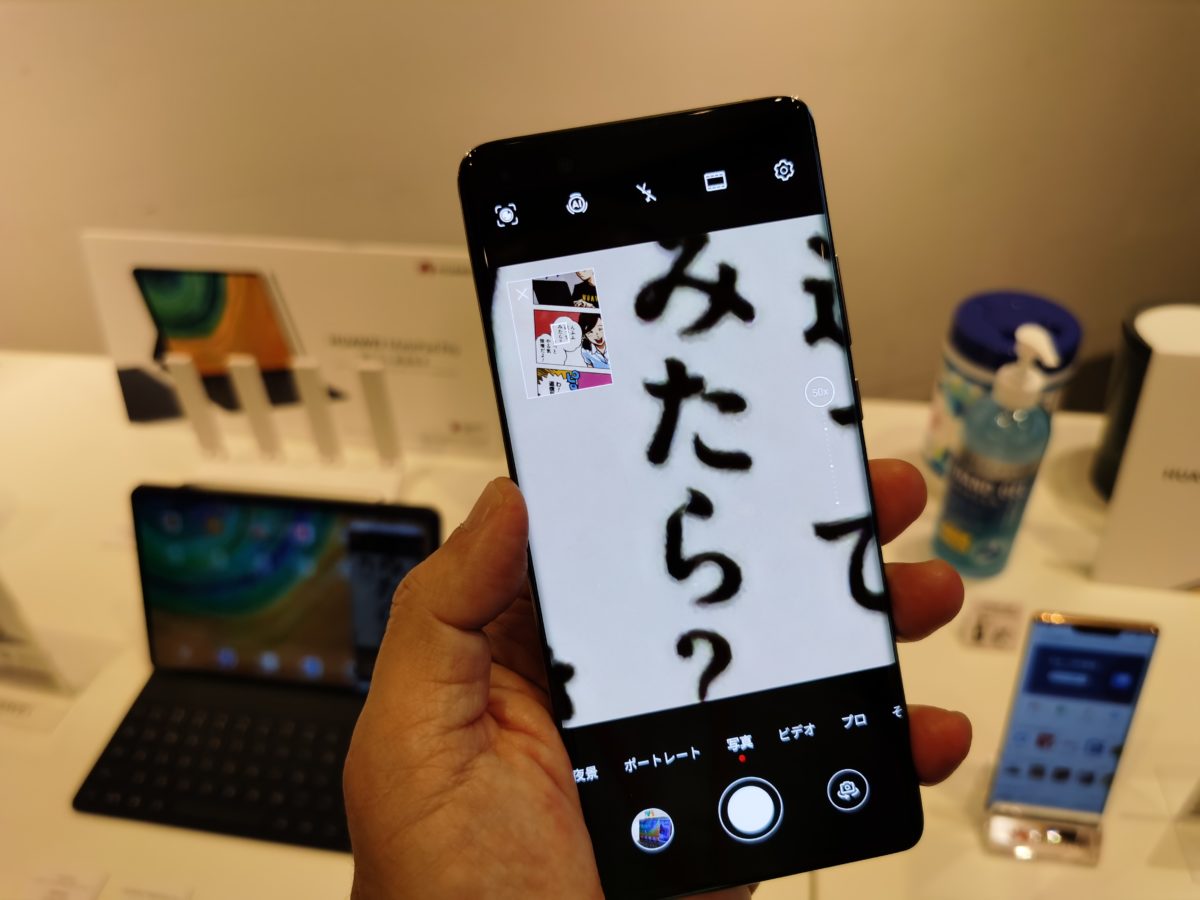 スマートフォンの目玉は、最新フラッグシップの「HUAWEI P40 Pro 5G」。ライカが監修したカメラを搭載する5G対応モデルです。カメラは広角(5000万画素)+超広角(4000万画素)+望遠(1200万画素)+ToF(被写界深度)という4眼構成で、光学で5倍、最大50倍ズームで撮影できることがセールスポイント。筆者も試してみましたが、50倍ズームでもかなり鮮明に撮れることに驚きました。