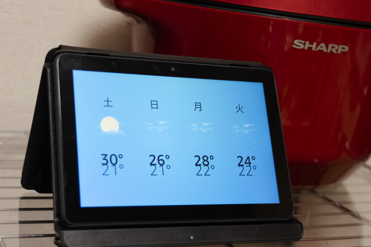 Fireタブレットならではの機能が「Showモード」。Amazon Alexa対応のスマートスピーカーと同じように話しかけて操作できるというものです。天気予報や家電操作など、一部の応答は画面でも表示されます。
