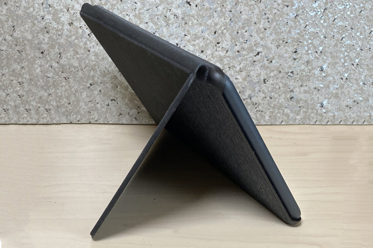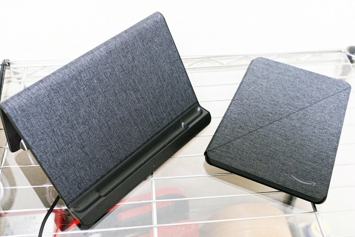 筆者は食事の時にはスマホをテーブルにおいて映画を観る習慣があるのですが、Fire HD 8 Plusなら取り外して設置するのもラクラク。スマホよりも迫力のあるサウンドで再生できます。専用カバーは折り紙のように畳んでスタンドになるため、別にスタンドを用意する必要もありません。