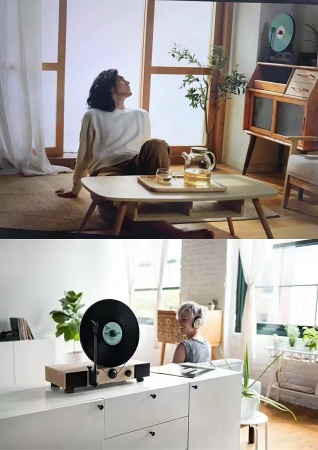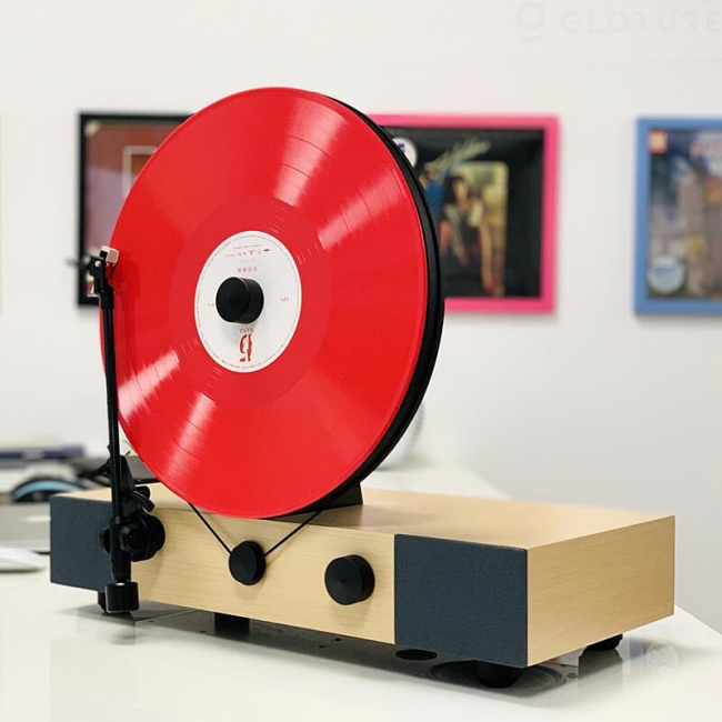 Jasmine Audioの「バーティカルレコードプレイヤー(J-TML01)」は、レコード盤を垂直に近い85度の角度に立てて再生できる点が特徴。レコード盤をターンテーブルに置くと針がゆっくりとスライドしていき、レコードがくるくると回る様子を眺めながら音楽を楽しめます。