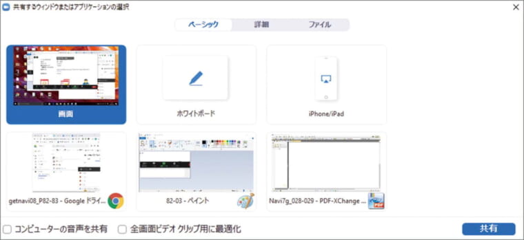 資料の説明やプレゼンなどの場面では「画面の共有」機能が便利。自分のPCで表示されている画面を、そのまま他の参加者へ公開できる。共有部分は映像として送られるため、PCとスマホなど異なる環境同士でも利用可能だ。