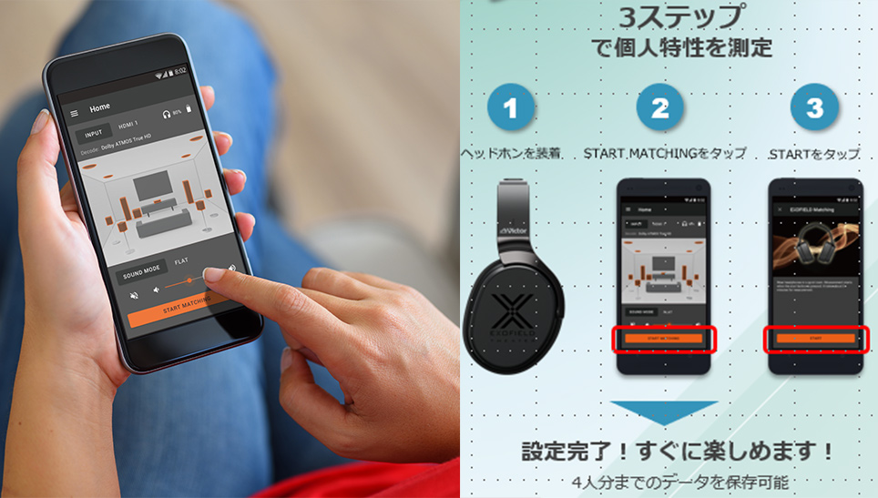 新開発の専用スマートフォンアプリにより、従来は専用のオーディオルームで行っていた個人特性の測定が自宅で簡単に行える点もポイント。ヘッドホン部に内蔵したマイクで個人特性を測定し、アプリ内のデータベースから最適なデータを抽出・生成することが可能となりました。イコライザ調整などのリモート操作もアプリから行えます。