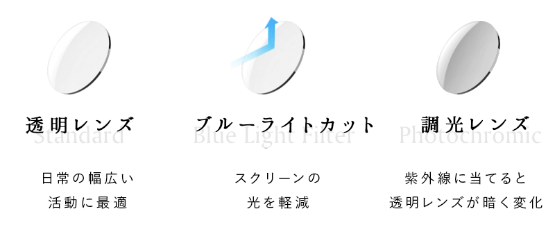フレーム形状は、四角い「Classic」と丸型の「Trendy」の2種類から選ぶことができ、レンズもブルーライトカットや色付レンズ、調光レンズなど5種類から用途や好みに合わせて選択できます。