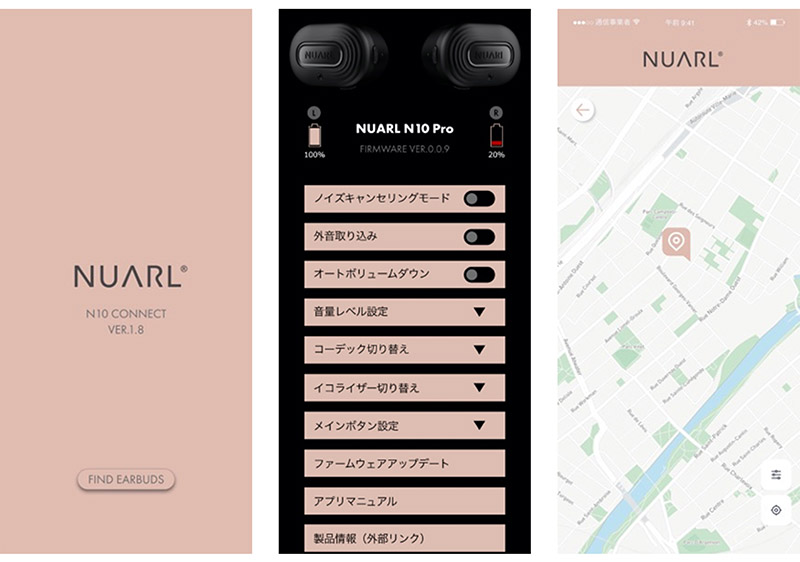 専用アプリを使用すれば、ANCのモードの切り替えやイコライザの設定などのカスタマイズも可能。ファームウェアのアップデート機能や、イヤホンの接続が切れた時点を地図上に表示する「Find Earbuds」機能も利用できます。
