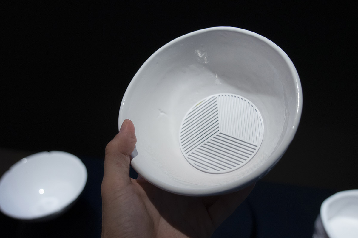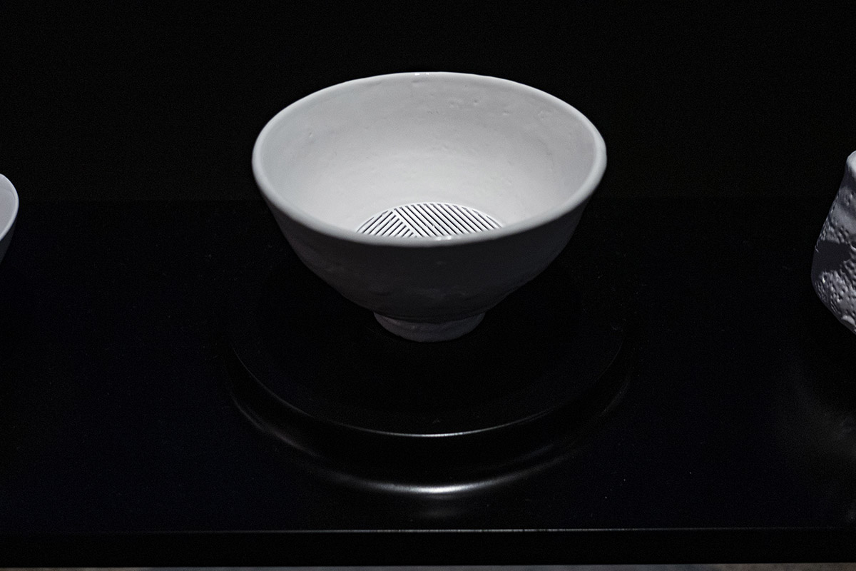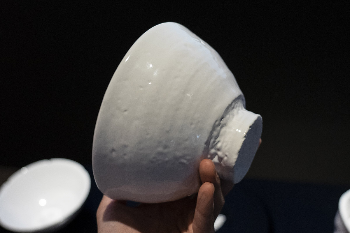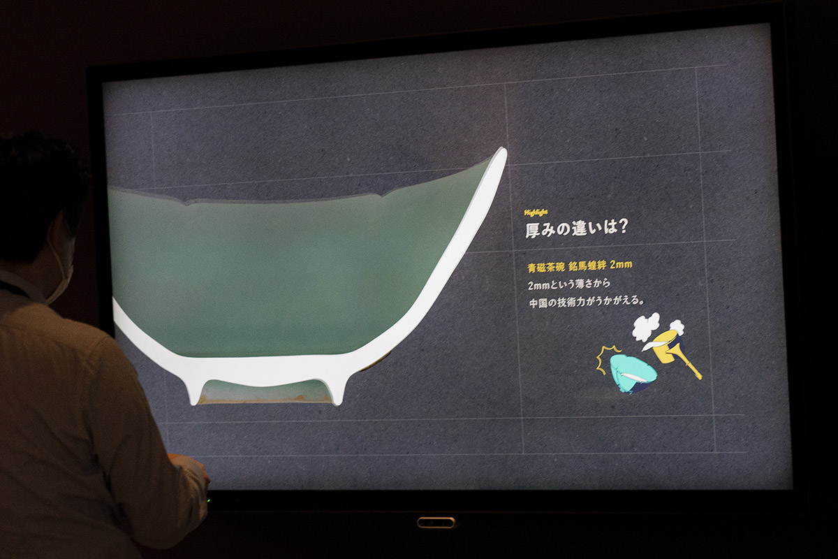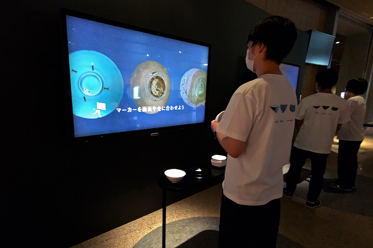 3Dモデルはシャープのスタッフが何度も展示室に通って実物と見比べて改良を加え、トーハクの陶磁器専門の研究員が監修し、実物の特徴に近づけています。茶碗型コントローラーは人工大理石を削り出しで制作されていて、塗装はないものの、釉薬(ニス)の塗り方や重心の位置まで再現されています。