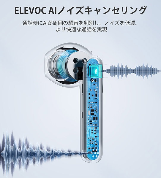 この「SoundLiberty88」は、耳を塞がないインナーイヤー型の完全ワイヤレスイヤホン。最大の特徴は、スマホでのハンズフリー通話やPCでの音声チャットなどに使用する際、ノイズを抑えてこちらの発する音声をクリアに相手に届ける「AIノイズキャンセリング」機能を搭載していること。これにより、屋外などの騒がしい環境下でも明瞭な音声での会話が可能となります。