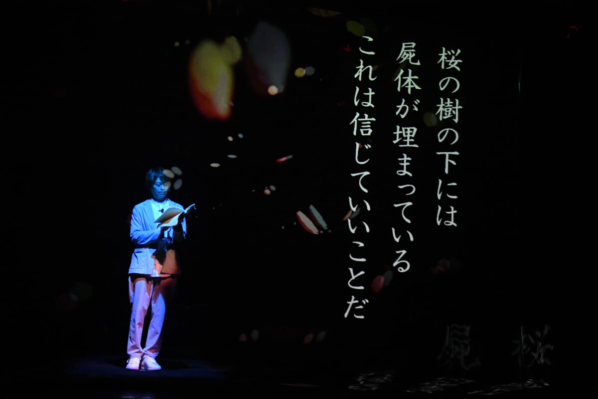 発表会では、今後配信されるであろうコンテンツの実演を見ることができました。オープニングアクトとして登場したのは声優の浪川大輔さん。梶井基次郎の『桜の樹の下には』の朗読劇で、浪川さんの言葉にあわせてスクリーンに映像が流れたり、効果音が入ったりします。