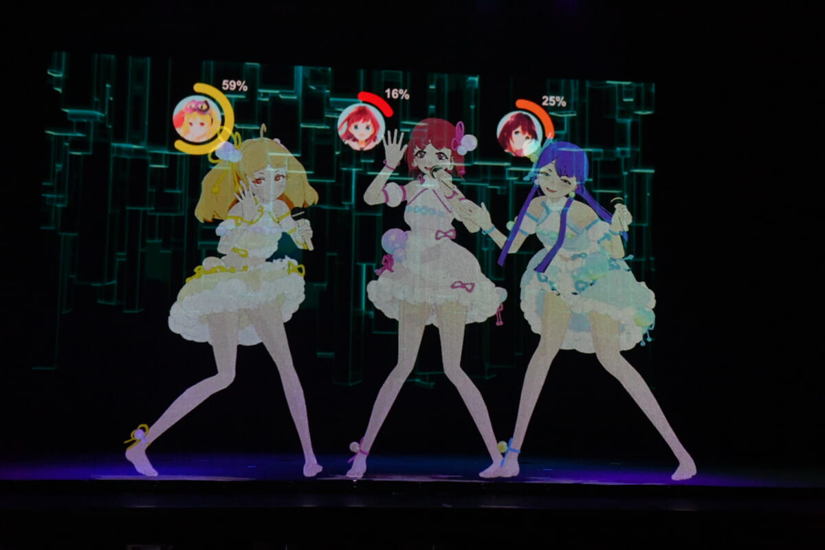 ライブのコール&レスポンスさながら、観客のアクションがアーティストやライブに影響するインタラクティブな仕組み。今後はステージから消えてスマホ画面に移動したり、衣装や演出方法を選べたりといった見せ方も考えているそうです。