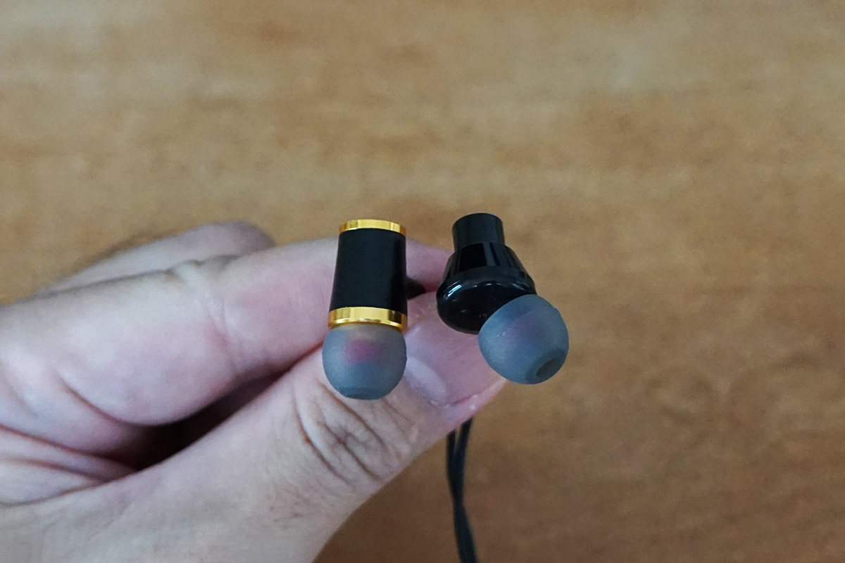続いてHQ-003を聴いてみます。こちらは黒のボディにゴールドのラインがあしらわれています。特筆すべきは、ハウジングの後方がパンチングされており、複数の穴が空いていること。そのせいか、ほかのモデルより若干音漏れしやすくなっています。