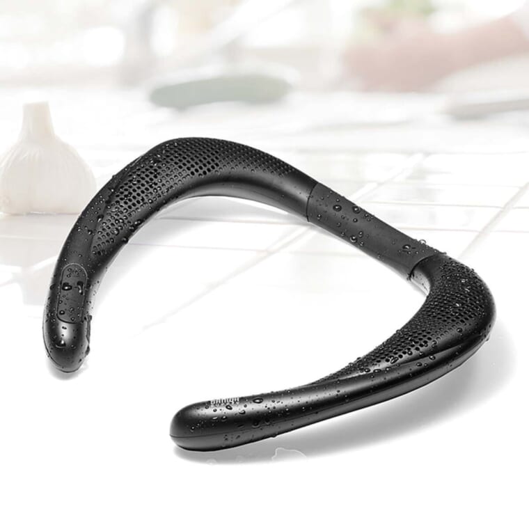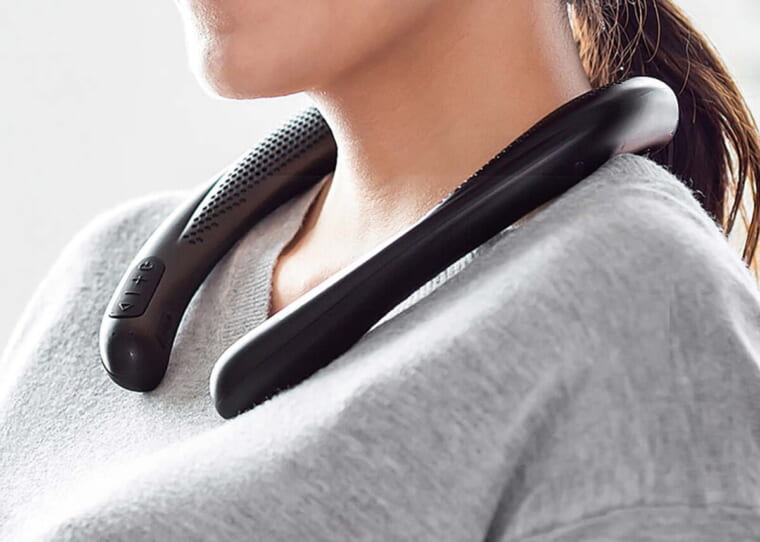 耳に音がダイレクトに届くよう設計された内向きのスピーカーを搭載、音漏れを気にすることなく、包み込まれるような感覚を楽しめる。首の後ろに当たる部分は柔らかいシリコン素材を使用し、長時間着けていても疲れにくい。