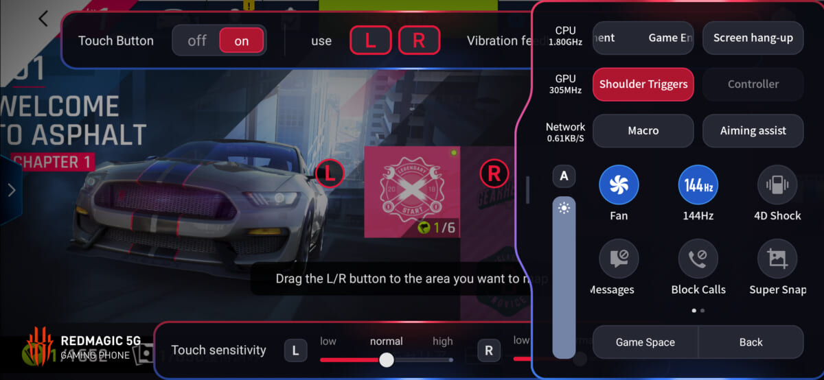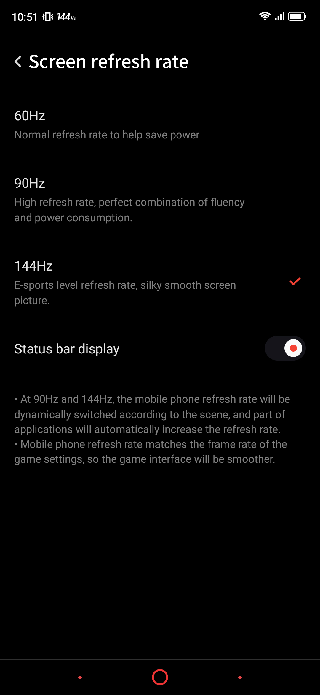 ゲーミングスマホは、ディスプレイの大きさと解像度に加えて、「リフレッシュレート」という画面の更新速度も強化されています。通常は60Hz(1秒間に60回更新)のところが、ゲーミングスマホでは、90Hzや120Hzに切り替えられるようになっているのが一般的。RedMagic 5では、さらに速い144Hzに設定できます。素早いタッチレスポンスが求められるゲームをプレイする場合、144Hzに切り替えるとストレスを感じることなくゲームに没頭できるという趣向です。
