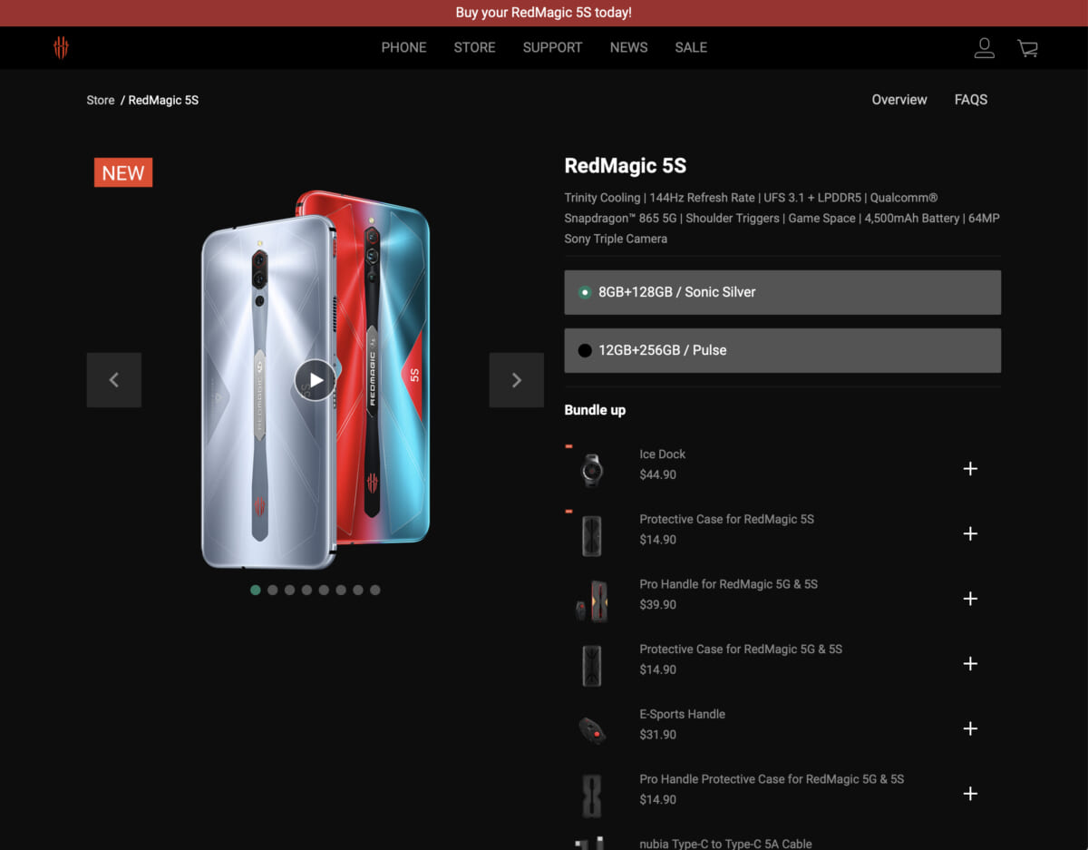 RedMagic 5の価格は、8GB+128GBモデル(Hot Rod Red)が629ドル、12GB+128GBモデル(Eclipse Black)が649ドルですが、これらのモデルはすでに完売しています。9月3日から、基本仕様が共通で、冷却性能などを強化した後継モデル「RedMagic 5S」が発売されたからです。RedMagic 5Sの価格は、8GB+128GBモデル(Sonic Silver)が579ドル(約6万1500円)、12GB+256GBモデル(Pulse)が649ドル(約6万9000円)で、これらの価格には配送料と税金が含まれています。
