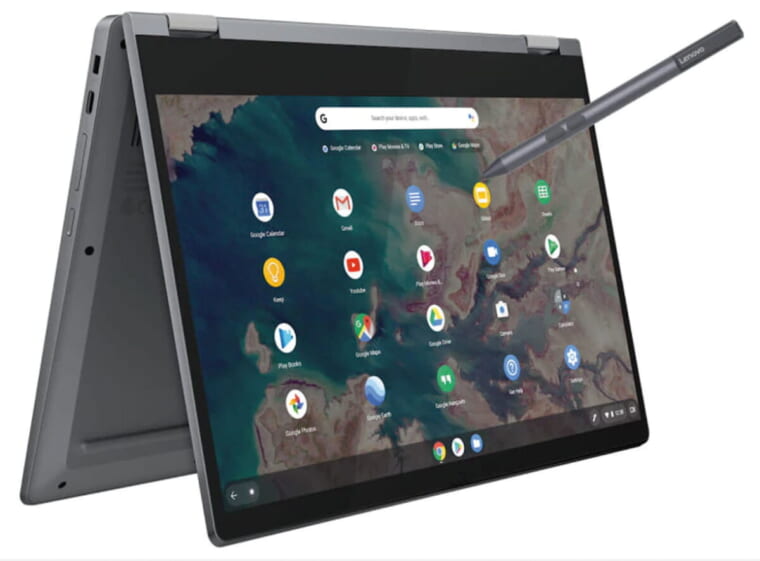 13.3インチモニターを搭載し、ペン入力にも対応するコンバーチブル型ノートPC。OSには、Google社が提供するChrome OSを採用する。Wi-Fi 6とBluetooth 5.0の2種のワイヤレス通信をサポートするほか、専用のスタイラスペンも付属する。