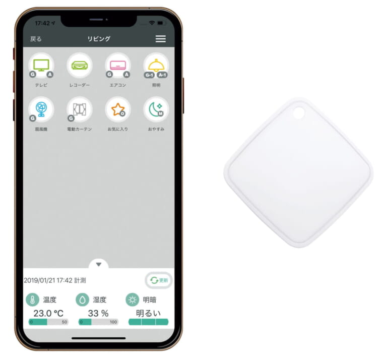 赤外線リモコンで操作する家電を、スマホアプリからコントロールできる学習型マルチリモコン。スマートスピーカーを併用すれば音声操作も可能。温度・湿度・明暗センサーを内蔵し、数値を確認したり、値に応じた操作を行なわせたりできる。