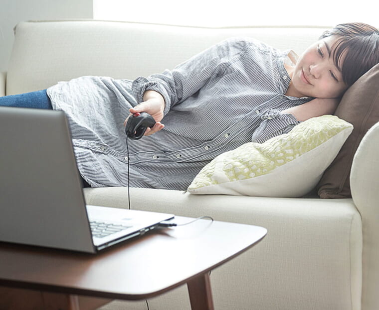 「一般的なマウスやトラックボールと違って、片手で持ち上げたまま空中で使えるのが最大の魅力です。腕を組む、だらりと下げる、寝転ぶといった姿勢でも使えるため、長時間利用しても手首・肘・肩が疲れにくい!」