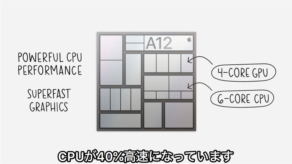 今回発表された第8世代iPadは、デザインは前世代モデルを踏襲しながらもスペックが大幅に進化していることが特徴です。iPhone XSやXRと同じA12 Bionicチップを搭載。前世代モデルと比較して、CPU性能は約40%向上し、グラフィックス性能は約2倍に高速化しています。