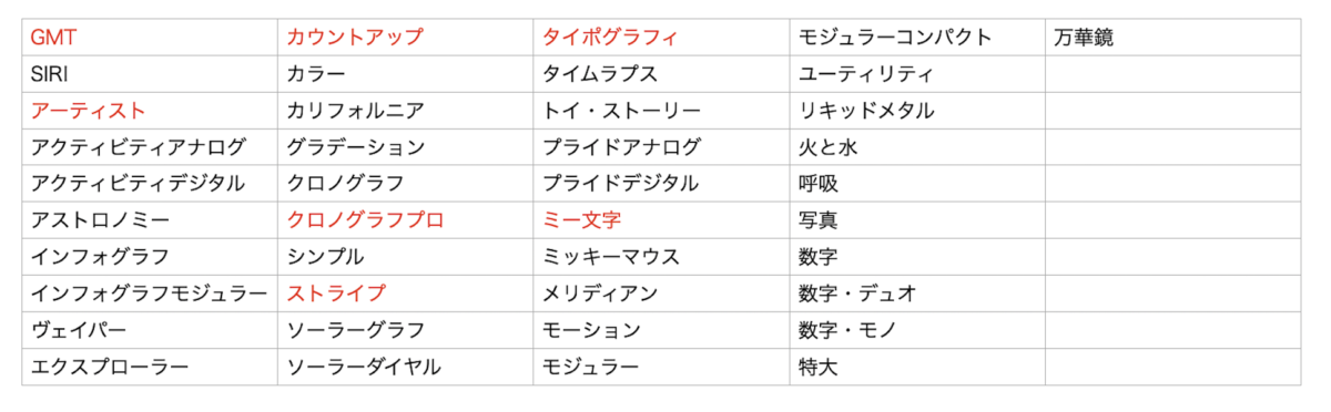 watchOS 7を搭載するApple Watch Series 6で選択できる文字盤は下記の41種類ありました。多くの文字盤ではさらにカスタマイズが可能です。