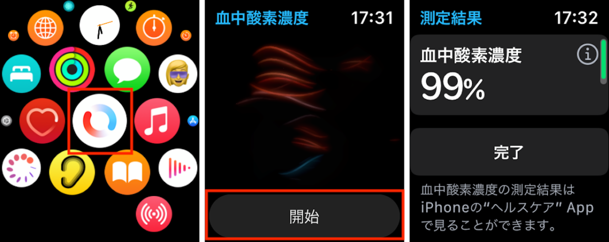 同機能を利用する方法は2つ。ひとつは、ウォッチ画面に表示される「血中酸素ウェルネス」アプリをタップして起動し、手動で測定する方法。もうひとつはバックグラウンドでの測定です。