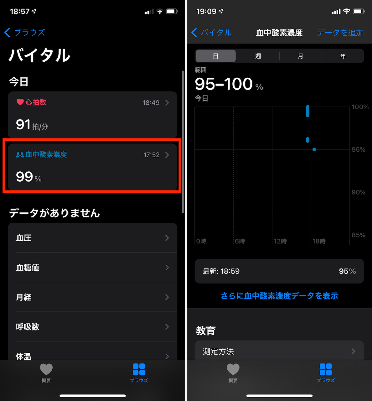 では、息を止めた状態で測定するとどうでしょうか。筆者の場合、1分弱くらい、可能な限り息を止めてから測定を試みたところ値は95%まで下がりました。結構苦しかったです。