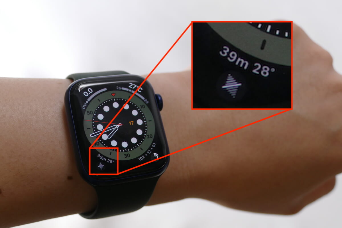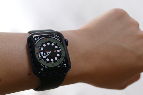 高度測定はSeries 5でも対応していた機能です。これがSeries 6では常時測定可能になりました。例えば、ハイキングなどのワークアウトを測定している分には、これまでも高度の表示を確認できました。しかし、Series 6では文字盤のコンプリケーションにコンパスを配置し、標高の変化を常に確認できるのです。電池の節約をしながら登山をしたり、現在の標高を知りたいような場面で活用できるでしょう。