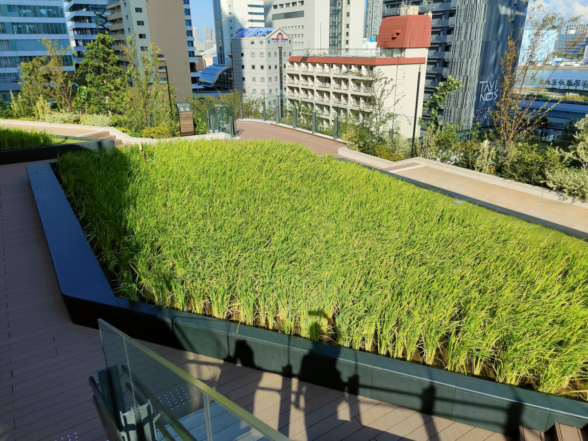 ブルーボトルコーヒーを片手で散策したいのが「ステップテラス」。3階〜6階にある広いテラスで、ベンチがあり、植栽があり、水田までありました。都会にいながら、四季を感じられる趣向ですね。
