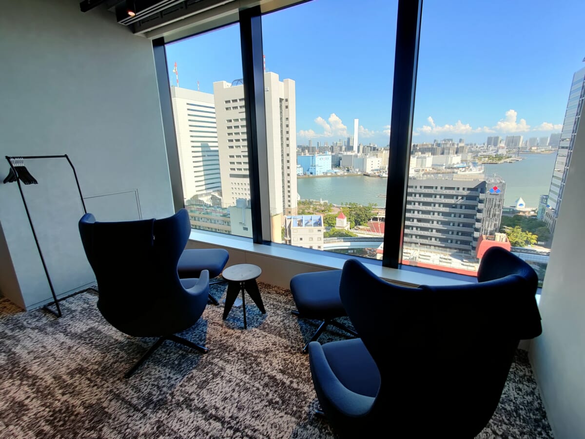 8階は「クリエイションフロア」。「ビジネスエアポート竹芝」という会員制シェアオフィスや、企業が映像撮影に使える「ポートスタジオ」などがありました。シェアオフィスは、空港のラウンジのような雰囲気。個人で利用することもでき、共用スペースを1日3000円(税別)で利用できるプランもあるそうです。立地を考えると、高くはないかもしれません。