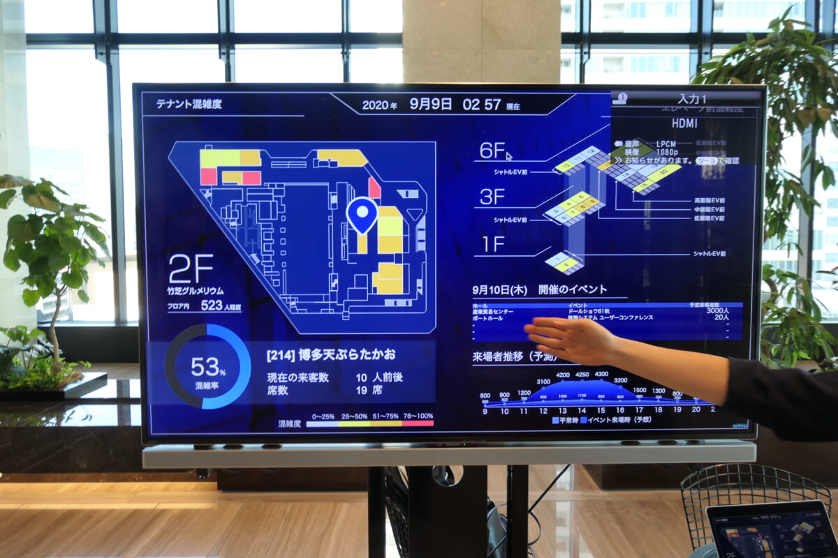 例えば、ソフトバンクの社員は、混雑状況を確認してから、トイレに行ったり、ランチを食べに行ったりできるわけです。エレベーターでの “密” を回避することもできます。こうした人の導線を俯瞰するシステムは、新たに建築するビルや施設でないと導入が難しいそうです。