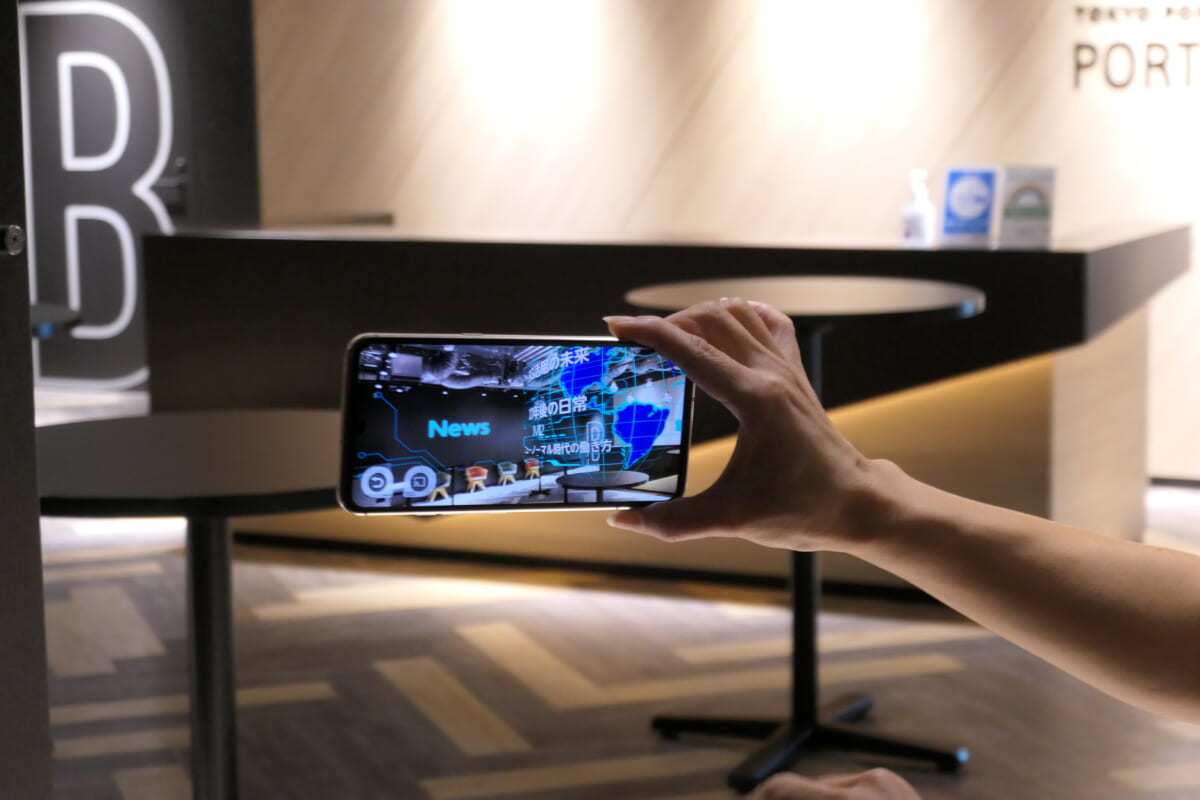 ソフトバンクは、このビルに入居するだけでなく、竹芝エリアをスマート化するプロジェクトにも関わっています。東京ポートシティ竹芝は、オープン時からソフトバンク5Gのエリアになっていて、Wi-Fiを繋げなくても、高速通信を利用でき、5Gスマホを使うサービスなども提供しやすくなっています。その一例として「5Gゲート」というデモを体験させてもらいました。ゲートをくぐるだけで、360°に雪山を見渡せるスキー場に行き、振り返って再びドアをくぐると現在地に戻るという、まるでドラえもんの “どこでもドア” のような感覚でした。