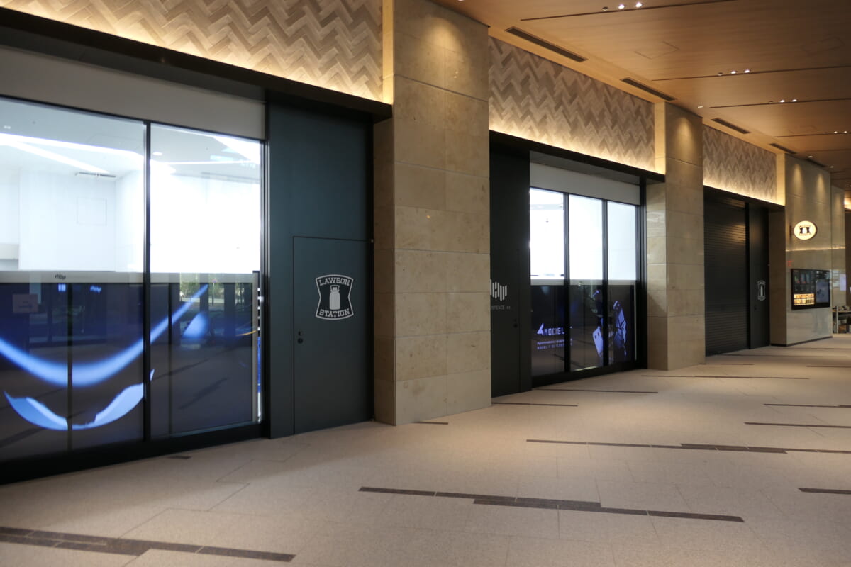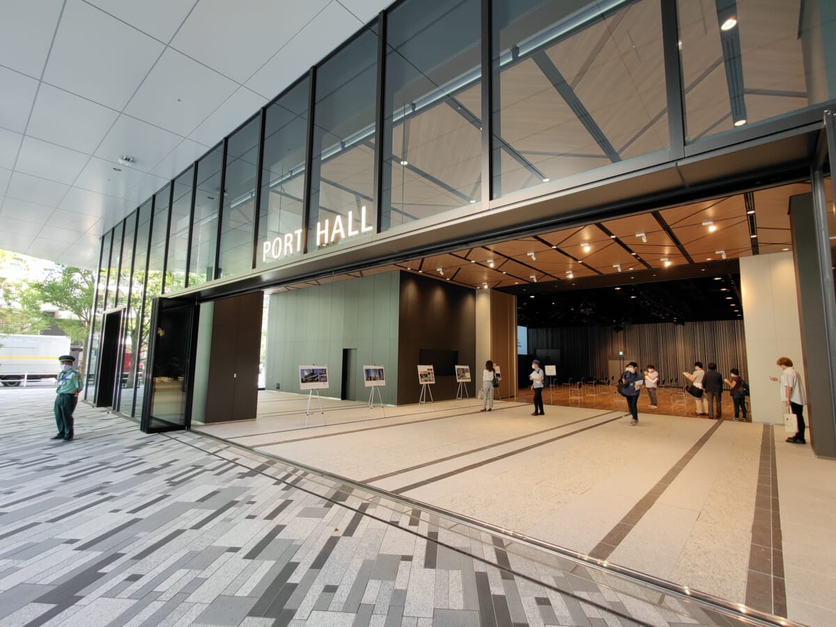 ビルの1階には、約350名を収容できる「ポートホール」があります。「ポートプラザ」という屋外の広場にシームレスで広がる構造なので、いろんなイベントで活用されそうです。1Fにはローソンとタリーズコーヒーが出店していて、ローソンは一部の商品の陳列業務をロボットが行う次世代型コンビニになっています。ロボットは店舗のバックヤードで稼働しますが、それをガラス越しに見られるゾーンも設置するそうです。