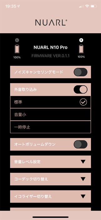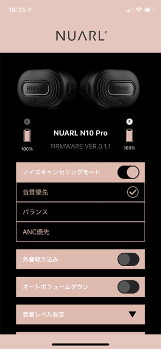 アプリを起動すると画面にはイヤホンのバッテリー残量がパーセント表示されます。音量レベルはLOW/MID/HIGHの3段階から切り換えられますが、あらかじめLOW/MIDに設定すると最大音量が絞られ、耳へのダメージが軽減できます。