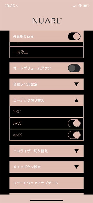 スマホなどBluetoothに対応する音楽プレーヤー機器との接続する場合、オーディオコーデックはaptX/AAC/SBCの3種類から選べます。アプリからコーデックを切り換えて音質の違いを楽しんだり、万が一バッテリーの残量が気になる場合は駆動時消費電力が少ないAAC/SBCを選択してもよいでしょう。
