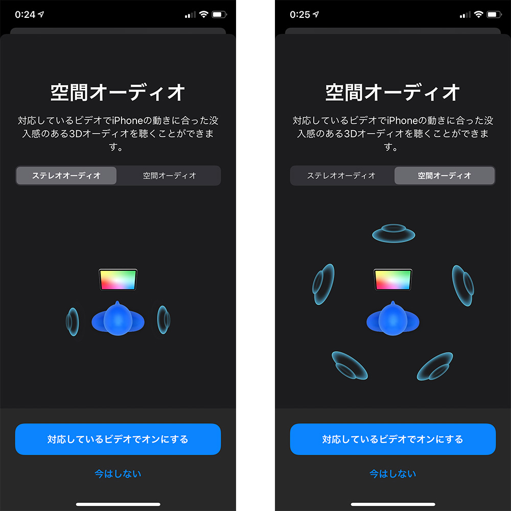 空間オーディオは5.1ch/7.1chのサラウンド音声、またはドルビーアトモスに対応する立体音声を収録したビデオコンテンツの没入感溢れるサウンドをAirPods Proで聴ける、今回のアップデートの目玉機能です。