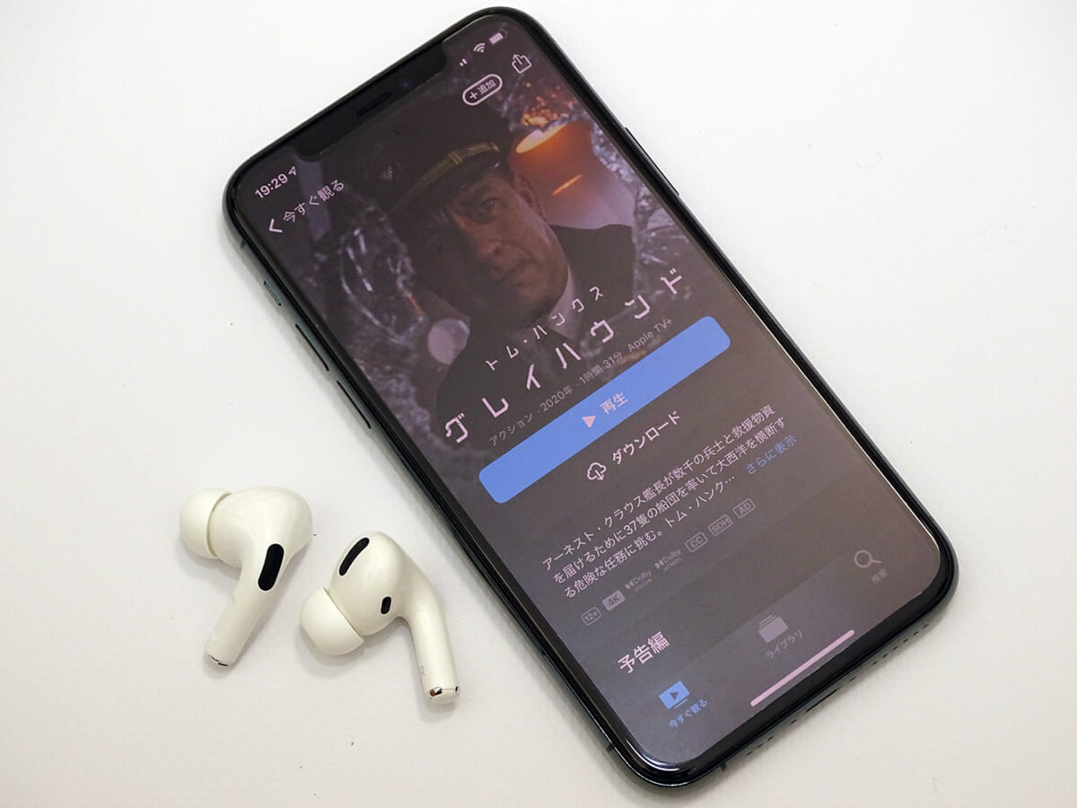 試しに、Apple TV+で公開されたトム・ハンクス主演の映画「グレイハウンド」をiPhoneで再生してみました。広々と描かれる音場空間の中で弾丸が飛び交う迫力は圧巻。顔の向きを変えてみてもヘッドトラッキングが遅れることなく正確に、音源をあるべき位置に再現します。空間オーディオをオンにすると、シリアスな会話のシーンで役者のセリフがより前に迫り出してきて明瞭に聴こえてきます。