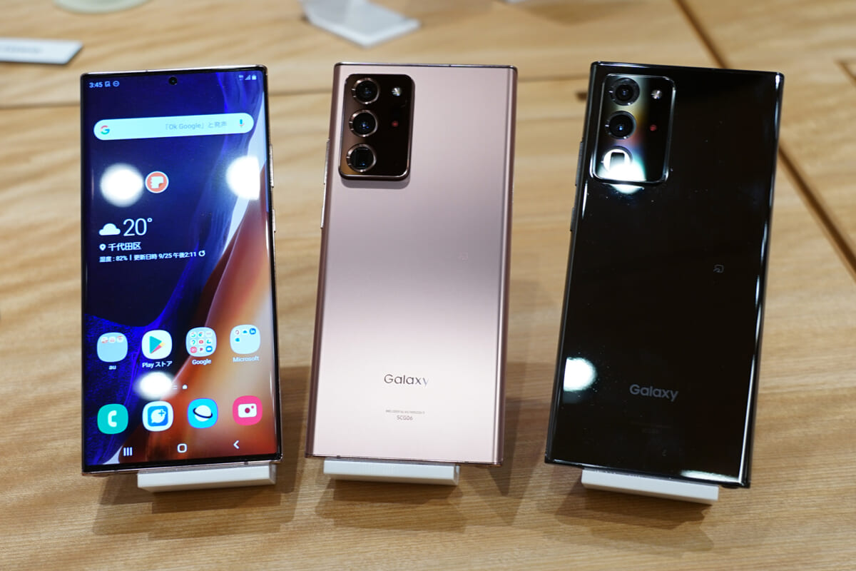 今回はあわせて、Galaxy Noteシリーズの最新モデル「Galaxy Note20 Ultra 5G」もラインナップしています。3モデルとも磨りガラス調の銅色「ミスティック ブロンズ」のカラーを投入されています。