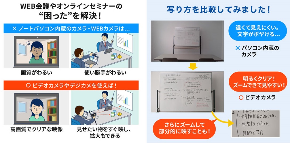 ノートパソコン内蔵のカメラは低画質で、写るアングルが悪かったり、写したい人や物をすぐに写せず、ズームや細かい調整もできません。高画質なビデオカメラやデジカメをwebカメラとして使えば、一般的なwebカメラより高精細な映像を見せることができ、また、ズーム・チルト・パン機能も使えるので、発言者や見せたい物にすぐレンズを向けたり、拡大・縮小の映し出しも可能になります。
