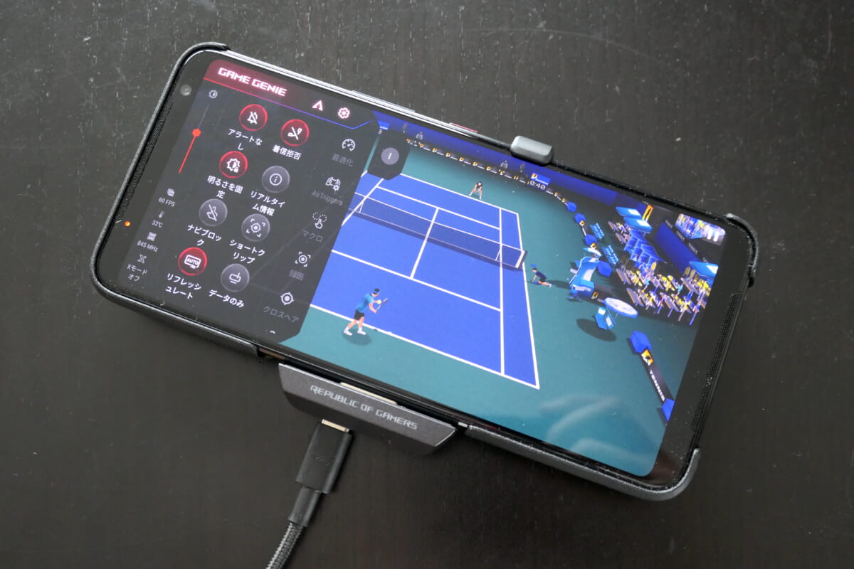 「フリックテニス 3D」というテニスゲームも試してみました。筆者が今までに使ったスマホよりも圧倒的にプレイしやすく、高スコアを狙えるように思えました。タップ&フリックのサーブやレシーブが直感的に行えて、画面が大きいので臨場感もアップしました。ROG Phone 3は、特に横向きで両手でプレイするゲームに適しているように感じます。