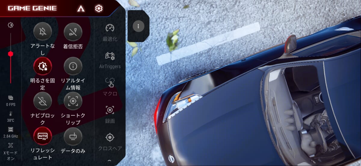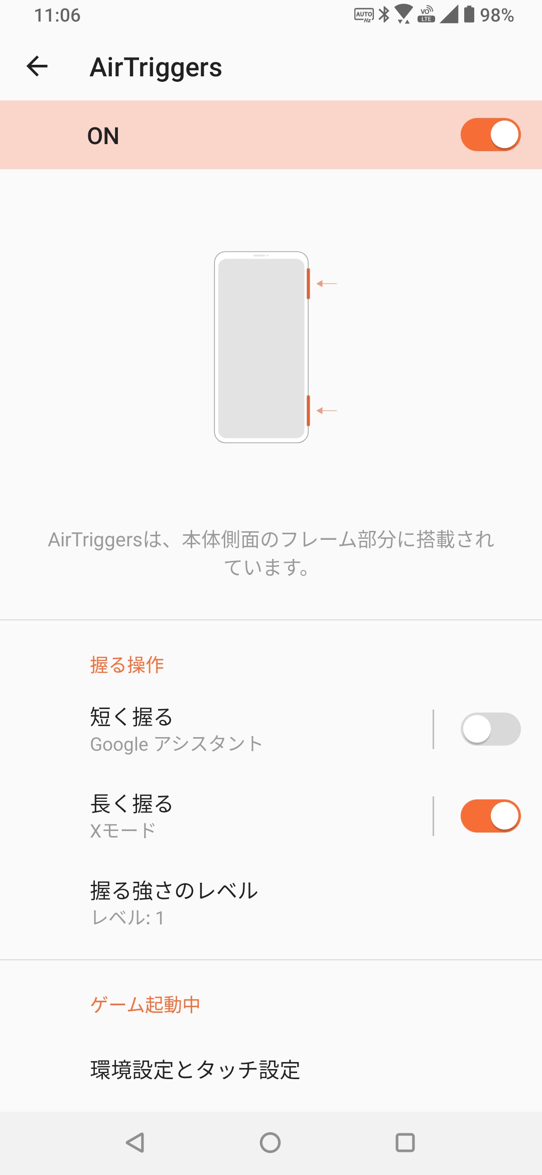 ボディの右側面の上下、つまり横向きにした状態での右上と左上には、触れた強さを感知するセンサーが内蔵されていて、「AirTrigger 3」という機能が実装されています。ゲームの操作に生かせる機能ですが、よく使う機能をワンタッチで起動するショーカットを割り当てることもできます。