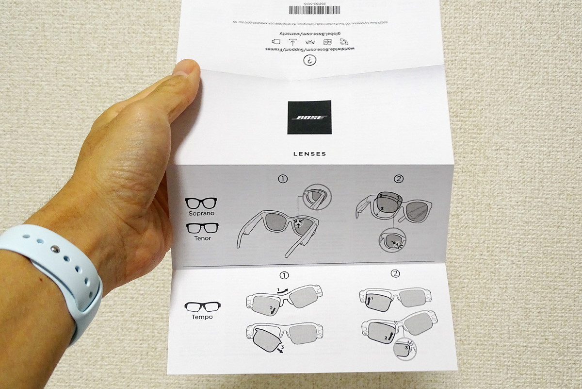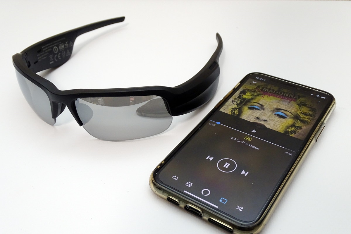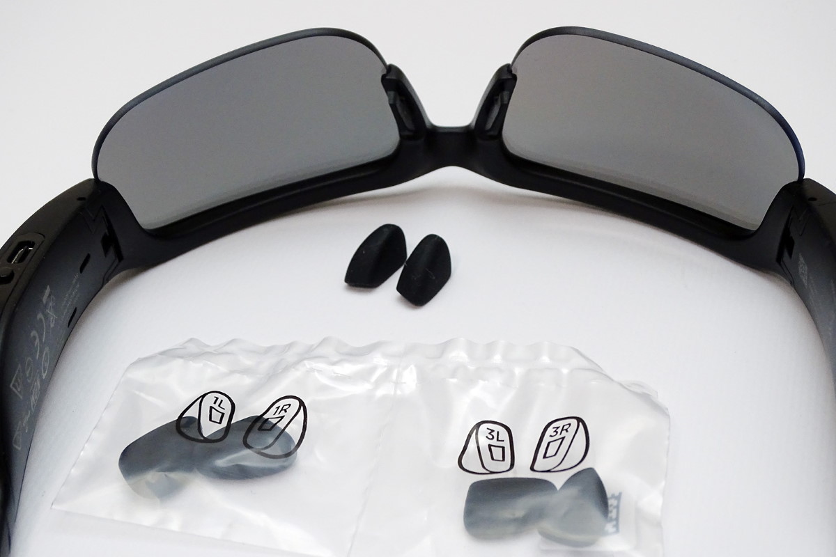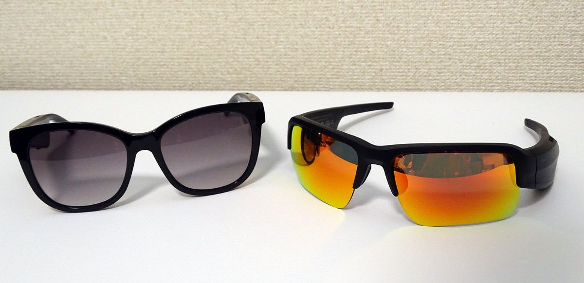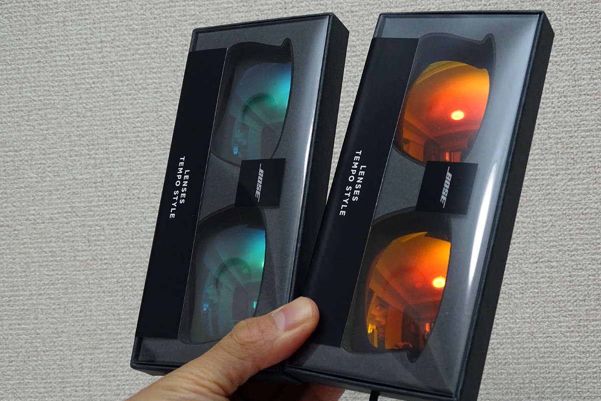 これはあくまで筆者の個人的な手応えですが、レンズのタイプ、フレームの形状と厚みが比較的近いSopranoは発売後に受け付けてくれる可能性もありそうです。ただ、スポーツタイプのTempoはレンズの湾曲がかなり強いため製作そのものが難しく、またレンズを固定する上側リムの溝の幅が決まっているため、厚みのある度付きレンズは装着できない可能性が高いと思います。本機についてはコンタクトレンズを付けてから、スポーツシーン等で音楽を楽しむ用途に向いているサングラスです。