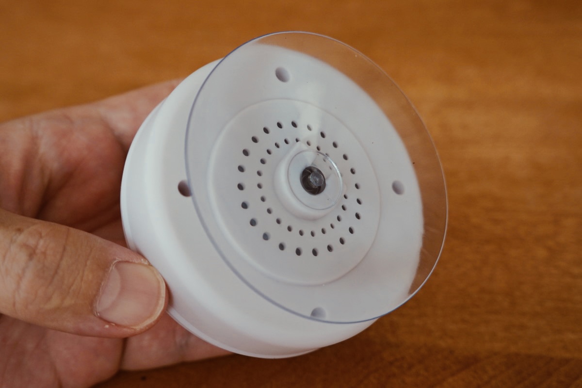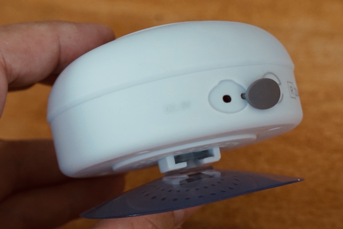 本体は、肉まんのようなフォルムで、底面に大きな吸盤が備わっています。これにより、タイルなどの平らな面に吸着させて設置できるので、置き場所がないところでも便利に使えます。