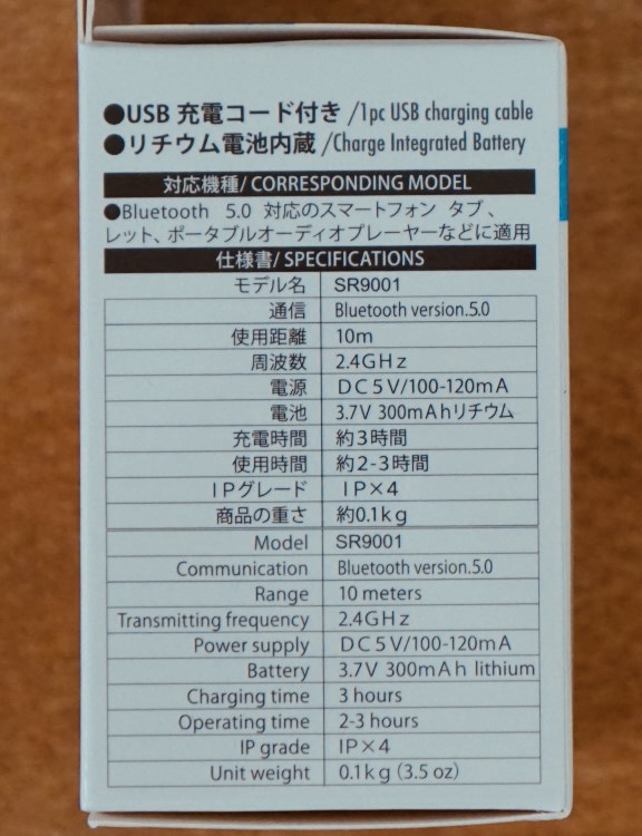スペックを見ると、通信規格はBluetooth 5.0で、使用距離は約10mまで。300mAhのバッテリーを内蔵しており、使用時間は2~3時間。充電時間は3時間となっています。