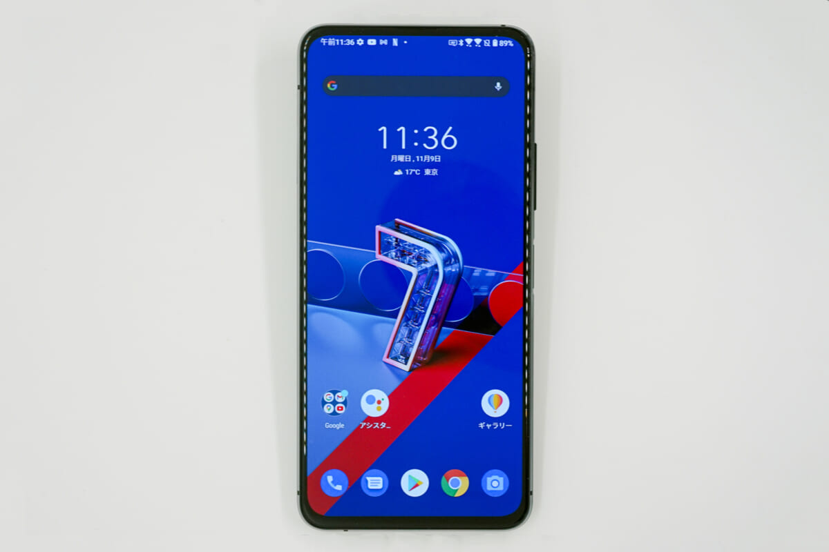 尖った機能を持つスマホだけに、デザインもエッジが効いています。ガラス貼りのツヤツヤした背面に、不敵に輝くASUSロゴ。ゲーミングスマホに通じる独特の格好良さを感じます。厚みがあるものの、背面のフチにかけて湾曲する形状になっており、手への収まりは悪くはありません。ただし、上部に重心があり、背面ガラスが滑りやすいため、ケースなしで片手持ちするのは落としてしまわないかヒヤヒヤします。