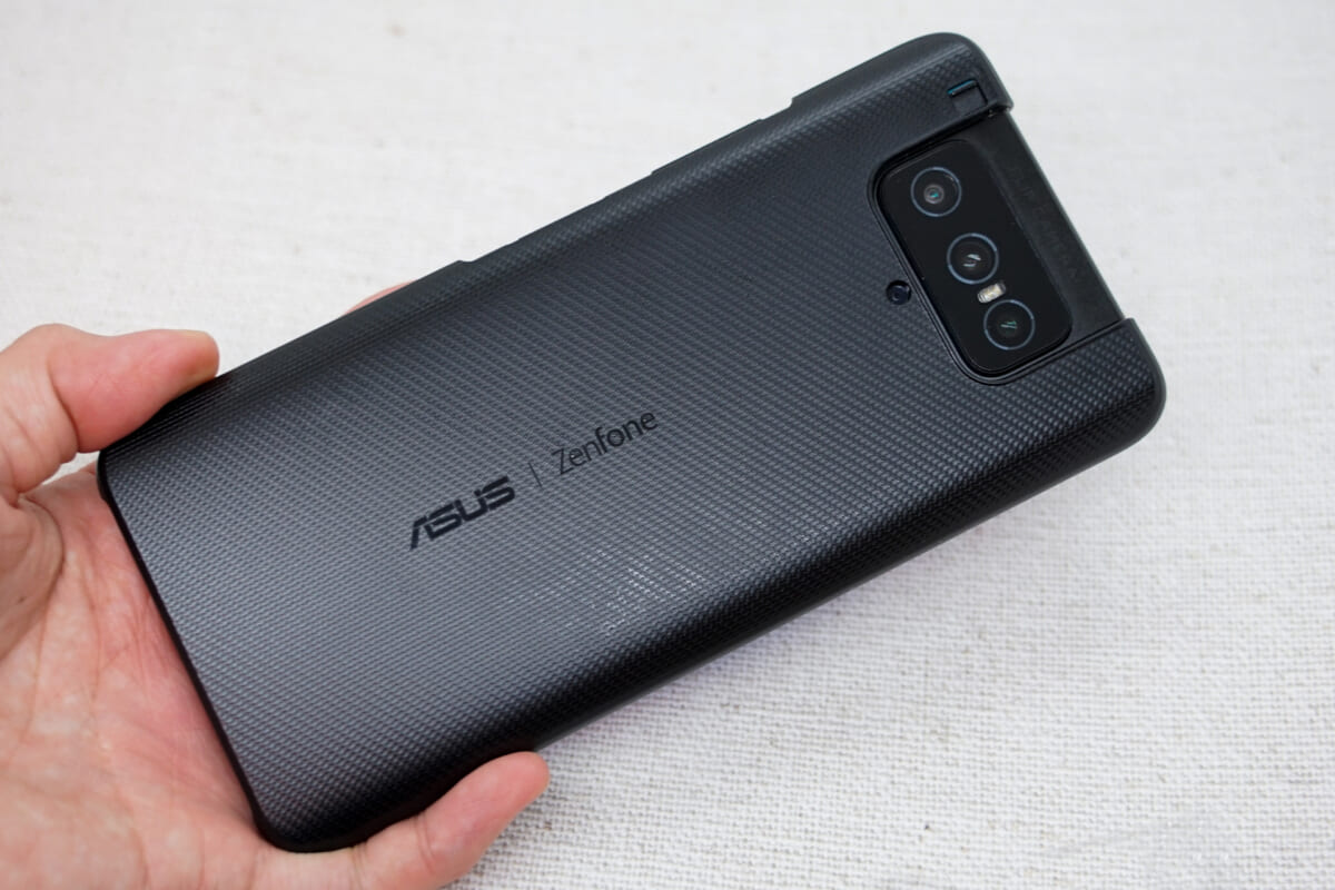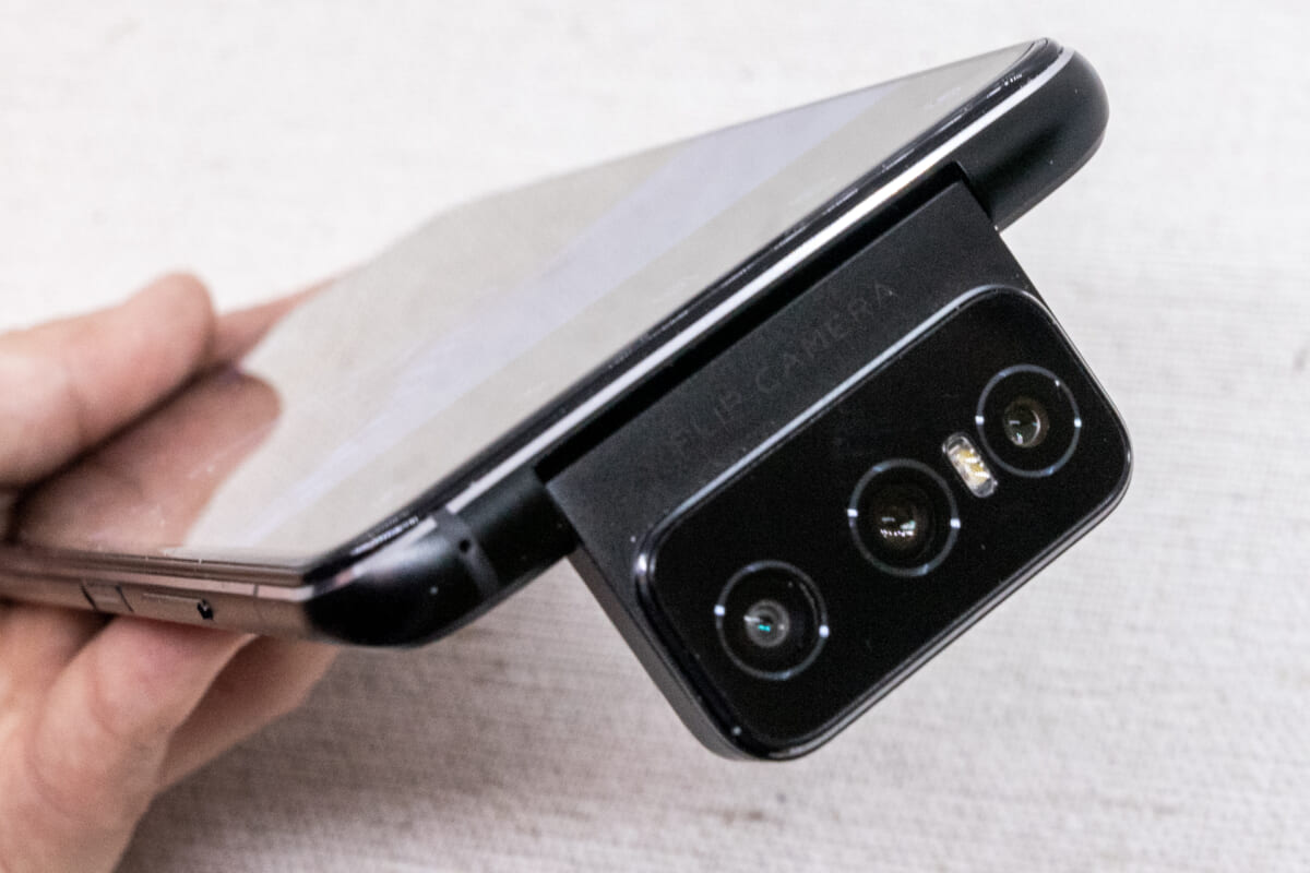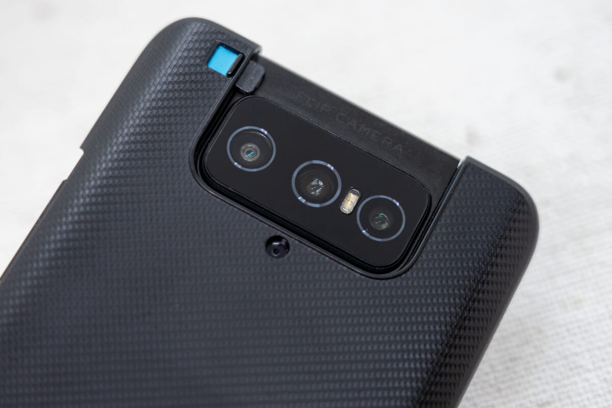 ZenFone 7 Proを語るなら、まずカメラからはじめるべきでしょう。ZenFone 6のユニークな「フリップカメラ」を引き継ぎ、3眼カメラにグレードアップしています。フリップカメラは、回転するカメラユニットによって外側カメラがインカメラを兼ねるという機構です。