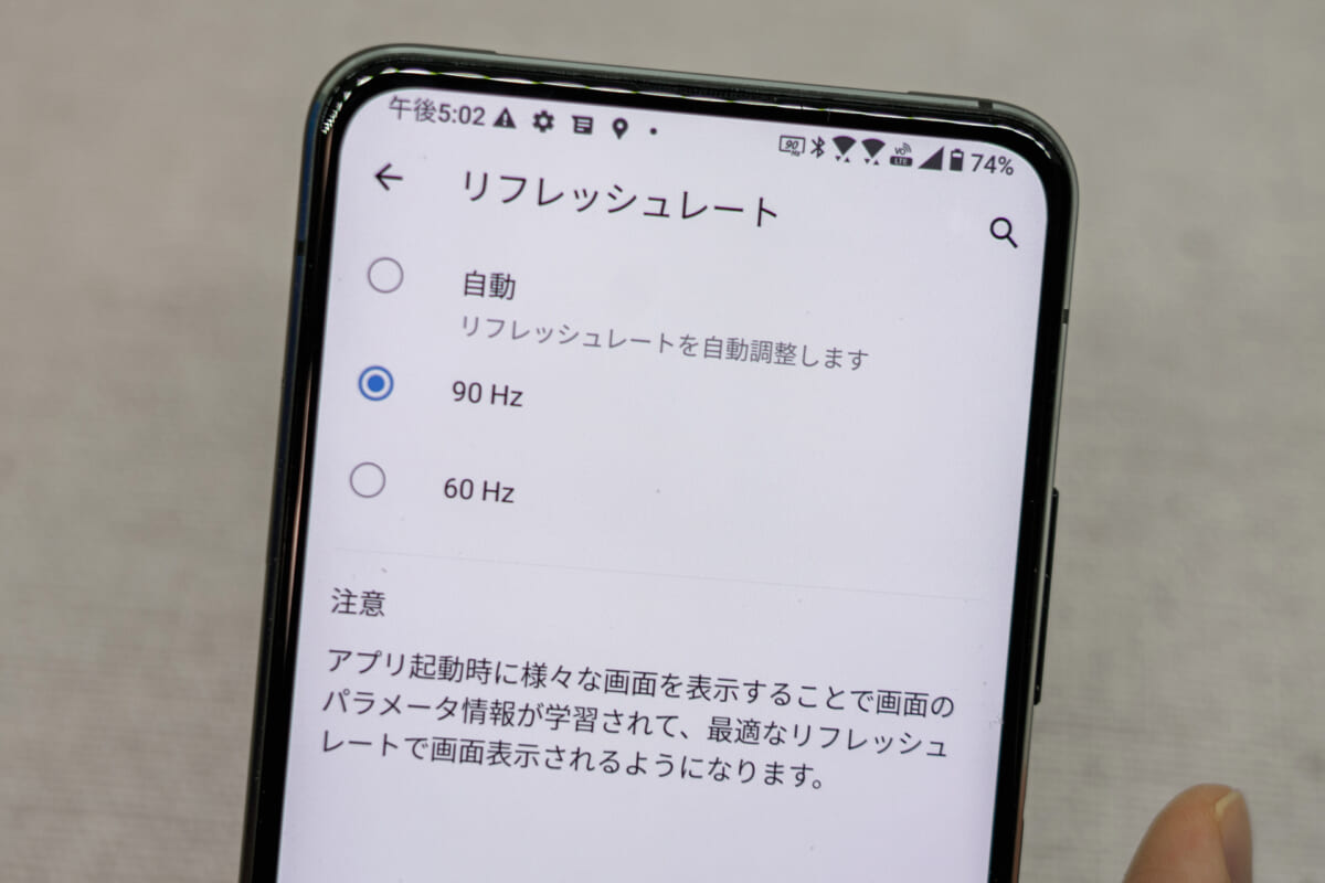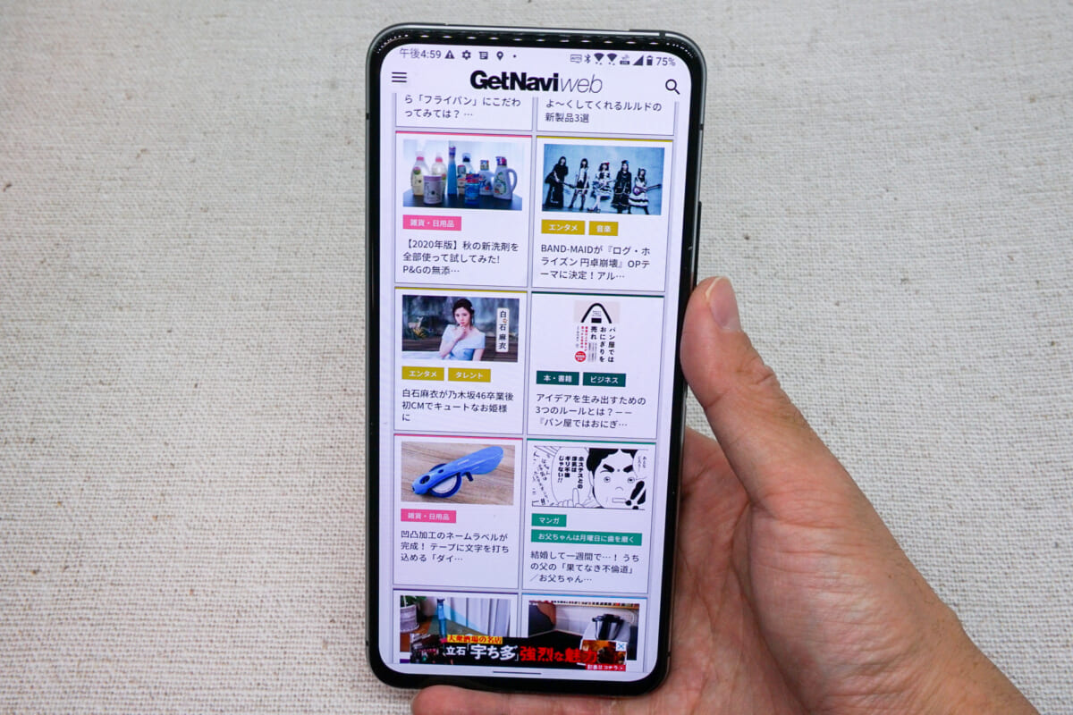 さらにディスプレイは90Hzのハイリフレッシュレートに対応しています。ハイリフレッシュレートは、PCゲームではお馴染みの、画面を高速に書き換える仕様ですが、スマホではスクロール操作の滑らかさにその良さが生かされます。目で追っても疲れづらい、滑らかな表示になります。Snapdragon 865 Plusの処理性能の高さもあり、WebブラウジングからSNSまですべてが快適。ただ、気になるのは重さ。230g近くあるため、たとえば、長時間手持ちで映画を観ると腕への負担がそれなりにかかります。