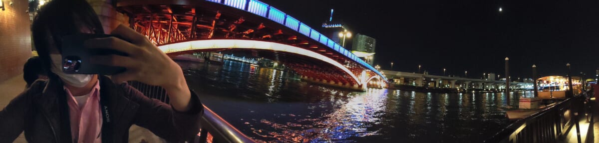 さらにユニークな撮影機能として「オートパノラマ」を搭載しています。これは自動でカメラを180度まで回転しながらパノラマ撮影する機能で、ダイナミックな風景とその場の自分を同時に記録できるというこのスマホならではの機能です。