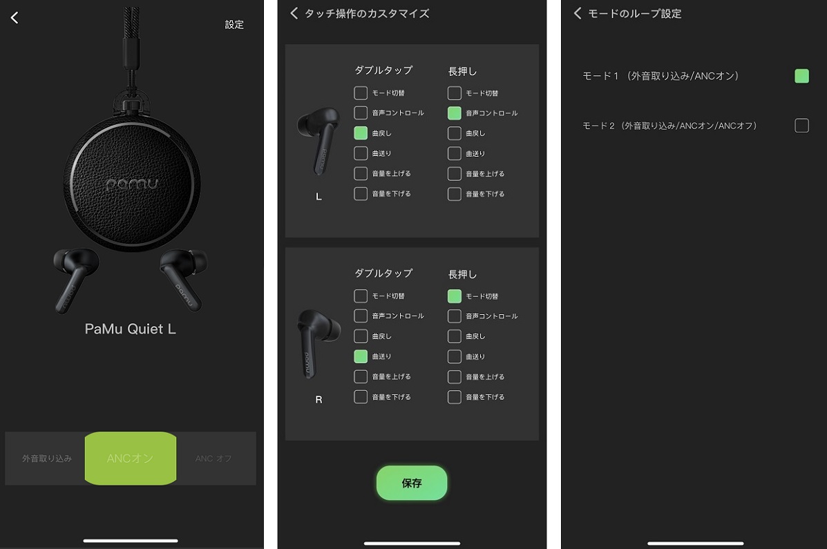 PaMu QuietにはAndroid/iOS用アプリが用意されており、アプリから様々な設定が可能。例えば、ノイズキャンセリング機能の切り替えは、デフォルトだと「ノイズキャンセリングモード」⇔「外音取り込みモード」ですが、アプリ上からは「ノイズキャンセリングON」「ノイズキャンセリングOFF」「外音取り込みモード」の3つから選択可能。このほか、イヤホンタッチ時の操作も自由にカスタマイズできます。将来的には、イヤホンのアップデートもアプリから行えるようになるので、PaMu Quietユーザーなら絶対ダウンロードしておきたいところ。