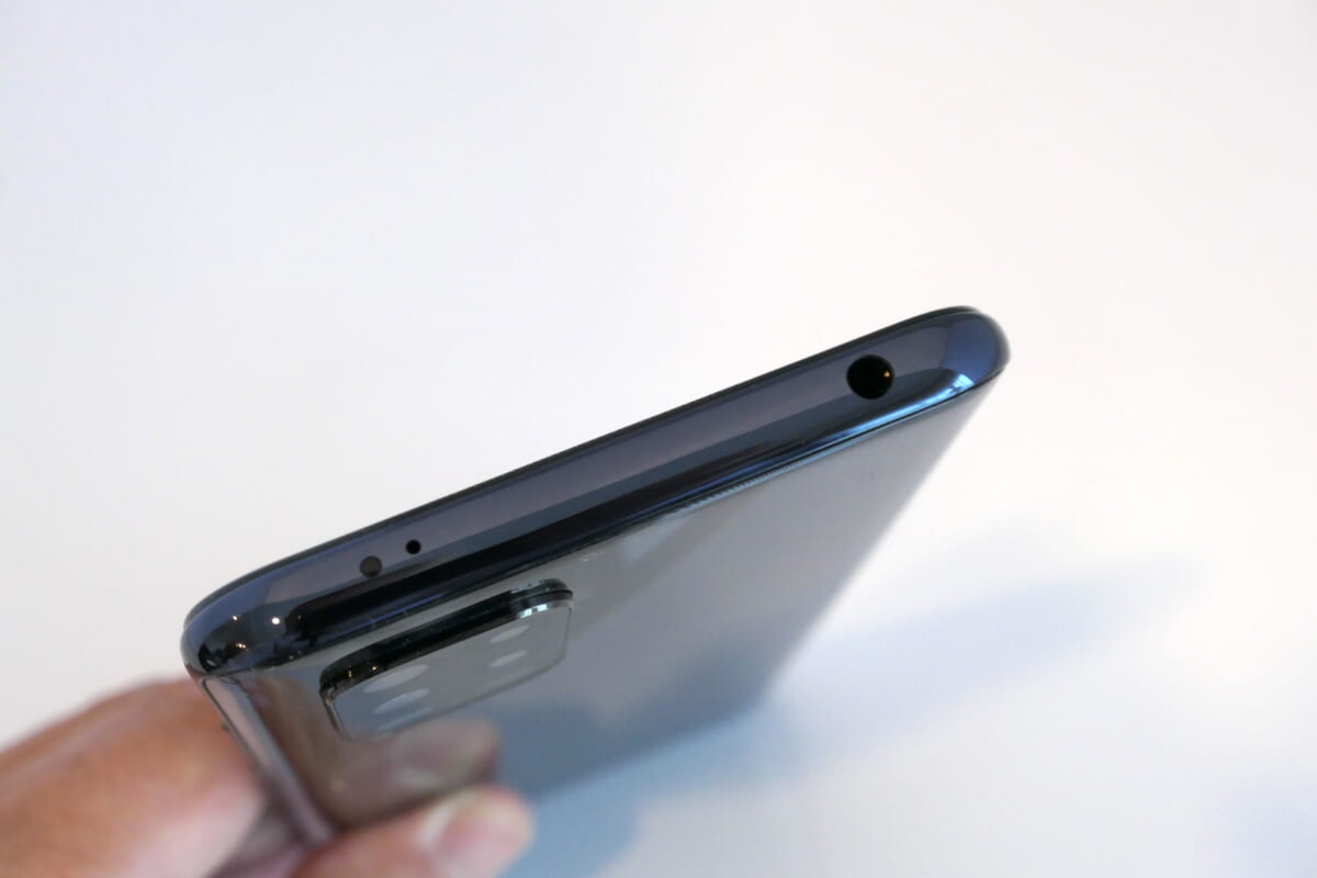 背面パネルは光沢が強めのリッチな仕上がりで、エッジ部にラウンド処理が施されているので、手にも馴染みやすい印象。クアッドカメラを搭載していることもあり、パッと見ではハイスペックモデルに見間違えそうです。