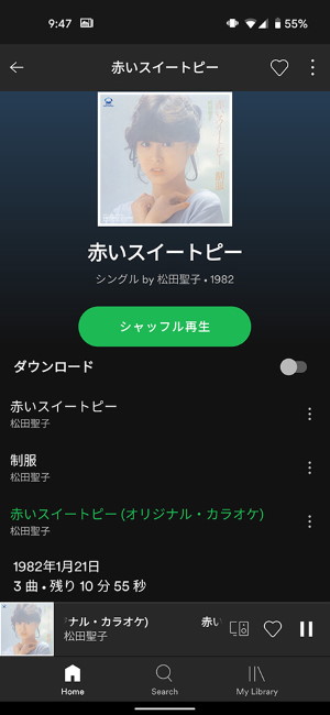 ただ、筆者の場合なぜか宮本浩次がカバーした「赤いスイートピー」の方が本家よりもマッチング率が上位に表示されます。Aメロから歌ってみたら、今度は本家の「赤いスイートピー」がトップマッチのタイトルとして出てきました。そしてSpotifyのリンクをたどって再生してみると、なぜかカラオケバージョンの「赤いスイートピー」の方が再生されました。