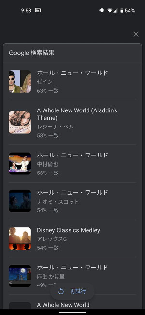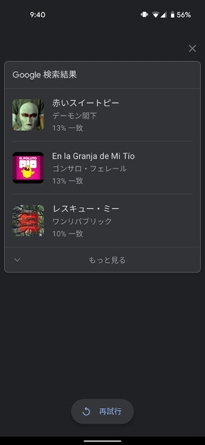 メロディ一致の判定はそこまで厳密ではないようです。例えば鼻歌や口笛の音程がある程度ずれていたり、リズムやテンポがあいまいでも何かしらの曲を見つけてきます。もちろん、あまりに原曲とズレている場合は期待外れの検索結果が表示されてしまうので、うろ覚えの歌の記憶がより鮮明で、鼻歌で楽曲のメロディをより正確に再現できた方が正答率は上がります。