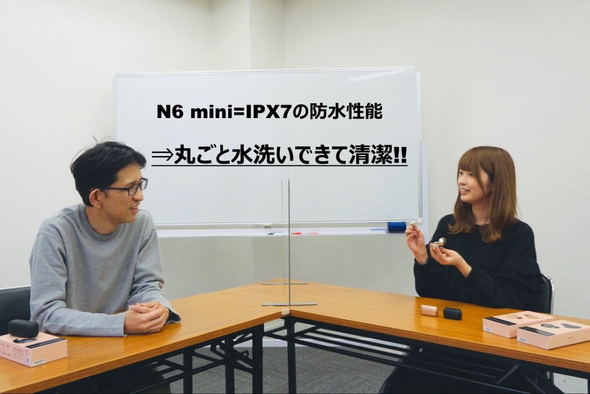 たにみく:むむっ、N6 miniの推しポイントはまだあるんですよ。イヤホン部分はIPX7の高い防水性能を備えているので、イヤホンを丸ごと水洗いできちゃうんです。ここはN10 Proには真似できないですよね! 汗をかいたり長時間装着しても、洗っちゃえばいいので楽チンです。こういう時期だから、イヤホンも常に清潔に保ちたいですし。
