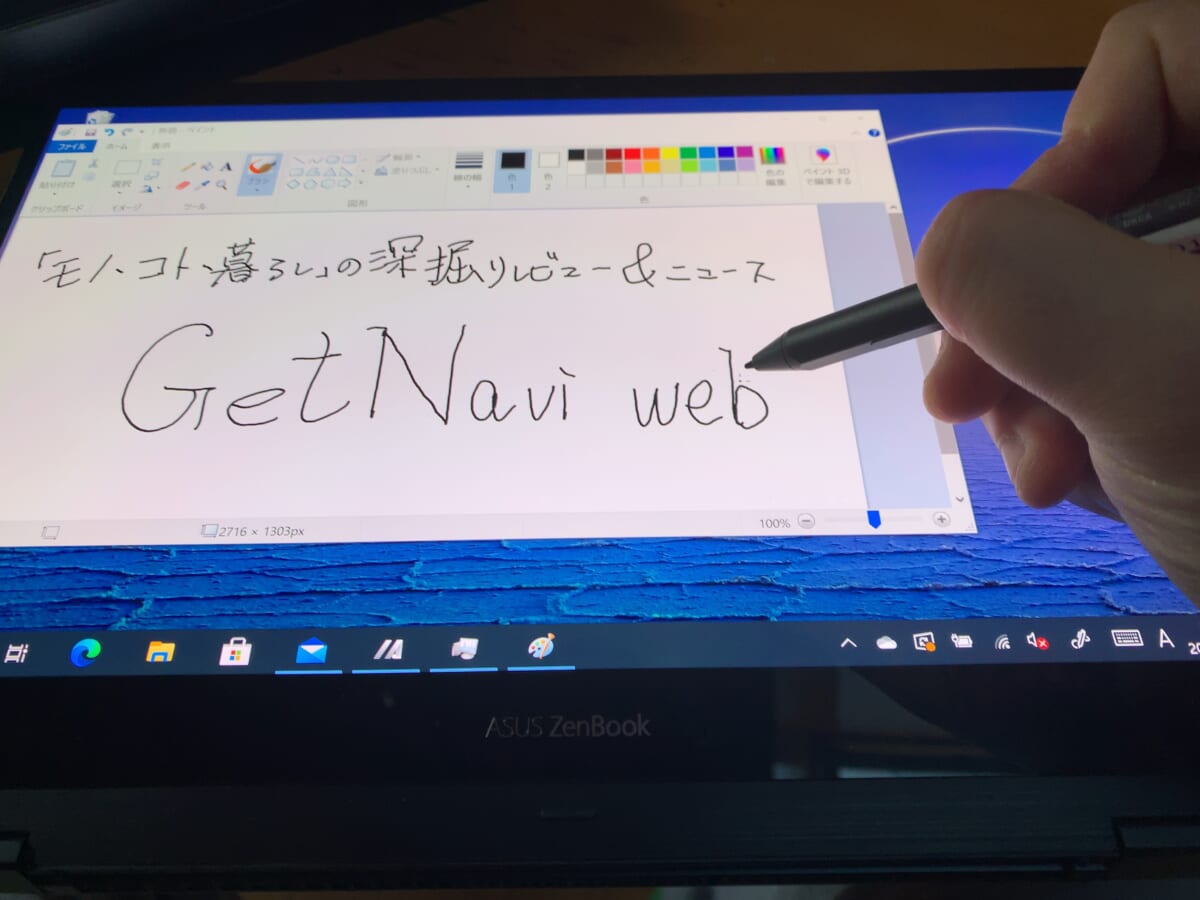一方、本機は、UX325EAにはない特徴も持ち合わせています。まずはディスプレイがタッチパネルになっていて、ペンの使用にも対応している点。手書きのメモとしても使えますし、ペイントソフトを使えば、絵を描くことも可能です。